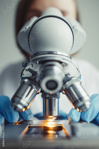 The watermark will not be included on Wall mural.: Close up of examining of test sample under the microscope in laboratory -
