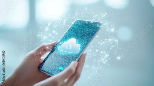 Wall mural : Close up of female hand holding mobile phone with digital shield and clouds on light blue background