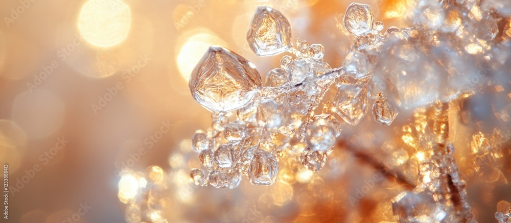 Wall mural : Close-up of glittering ice crystals with warm bokeh background and copy space for text -