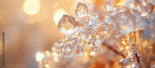 Wall mural close-up of glittering ice crystals with warm bokeh background and copy space for text.