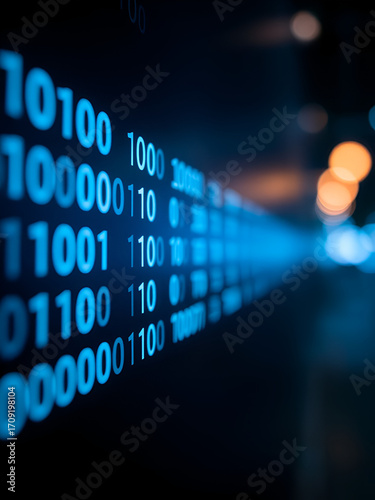 Wall mural close up of glowing blue binary code on a dark background with bokeh effect on the right side view - Wall murals Wall mural close up of glowing blue binary code on a dark background with bokeh effect on the right side view - Wall murals