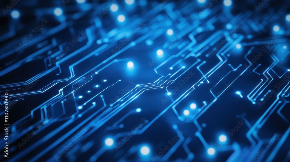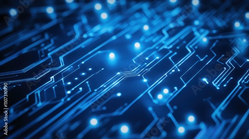 The watermark will not be included on Wall mural.: Close-up of glowing blue circuit board with intricate pathways and illuminated points -