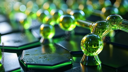 Wall mural close-up of green molecular structures on a hexagonal surface