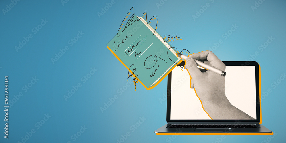 Wall mural close up of hand writing in abstract drawn notepad on blue background with mock up place. back to sc