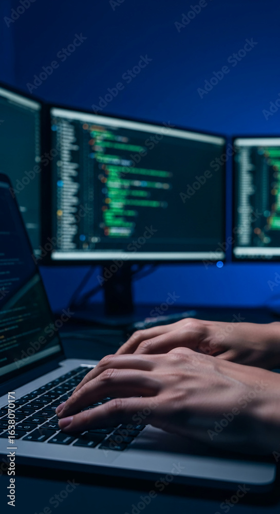 The watermark will not be included on Wall mural.: Close-up of hands typing on laptop keyboard, multiple monitors displaying code in background, showca