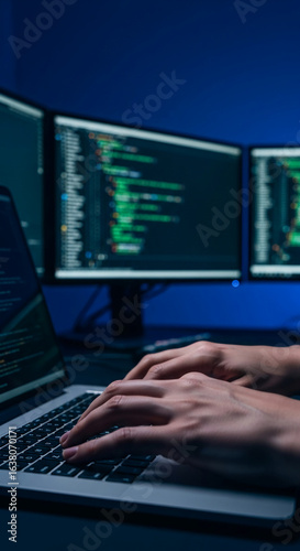 Wall mural : Close-up of hands typing on laptop keyboard, multiple monitors displaying code in background, showca