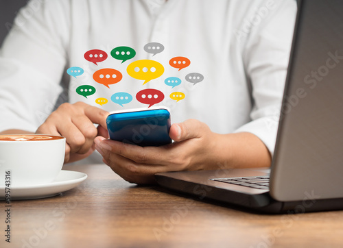 Wall mural : Close-up of hands using mobile phone with colorful chat icons on application communication digital