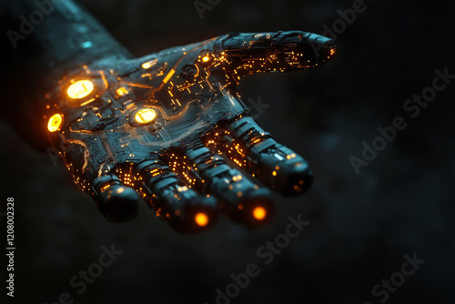 Wall mural : Close-up of high-tech robotic hand illuminated with glowing orange circuits - digital hand hologram o