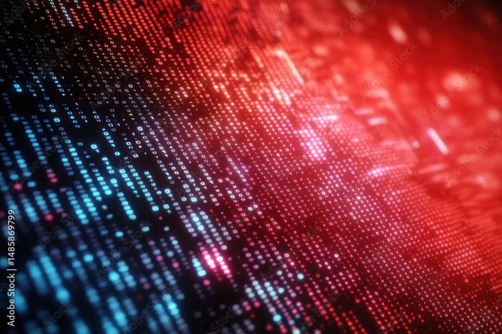 The watermark will not be included on Wall mural.: Close-up of illuminated digital binary code in blue and red colors on a dark background representing
