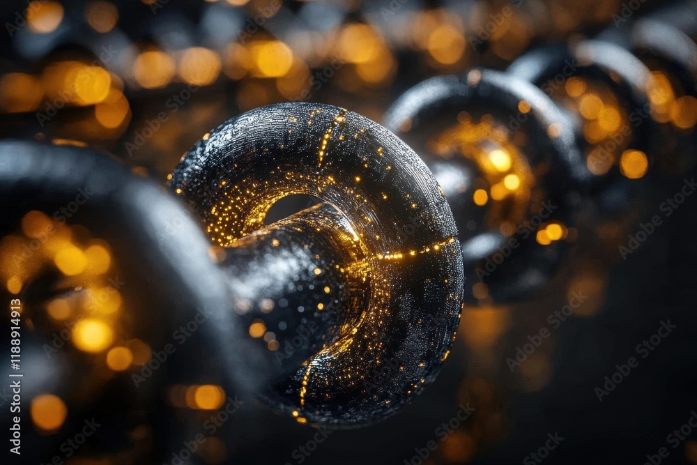 The watermark will not be included on Wall mural.: Close-up of interconnected metallic chains with a shimmering golden effect and a dark background hig