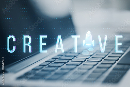 Wall mural close up of laptop computer with creative text and spaceship replacing letter on blurry background w
