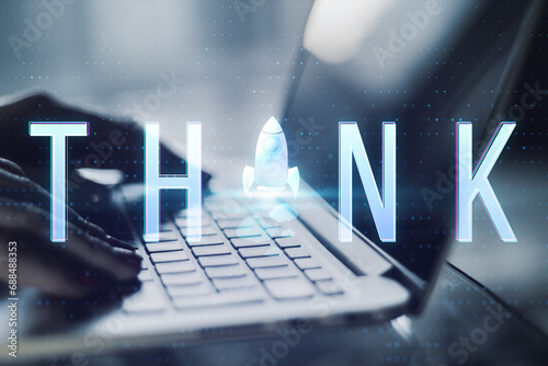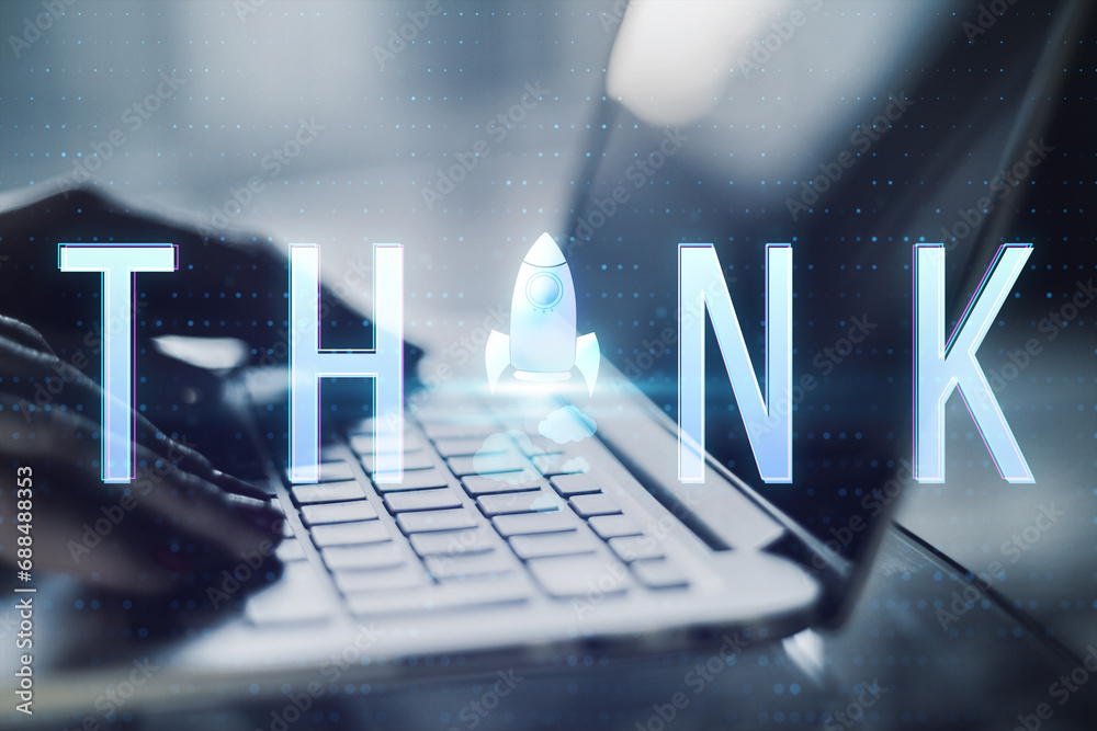 Wall mural close up of laptop with creative text and spaceship replacing letter on blurry background with bokeh