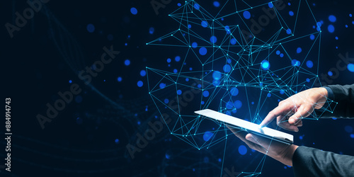 Wall mural close up of male hands using smartphone with glowing blue plexus pattern hologram on blurry backgrou - Wall murals Wall mural close up of male hands using smartphone with glowing blue plexus pattern hologram on blurry backgrou - Wall murals