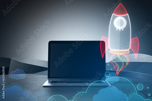 Wall mural close up of mock up laptop with creative rocket ship sketch on blurry background. content launch and