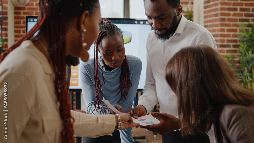 Wall mural : Close up of multi ethnic team working on business project, using documents with charts and data anal