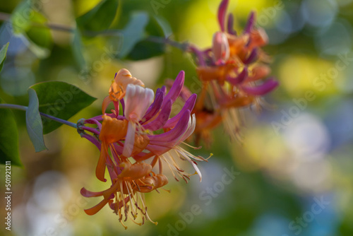 The watermark will not be included on Wall mural.: Close up of nature view flowers and leaves on blurred greenery background with bokeh and copy space