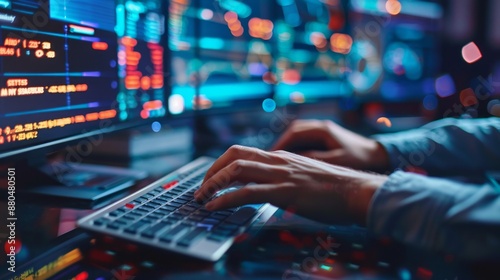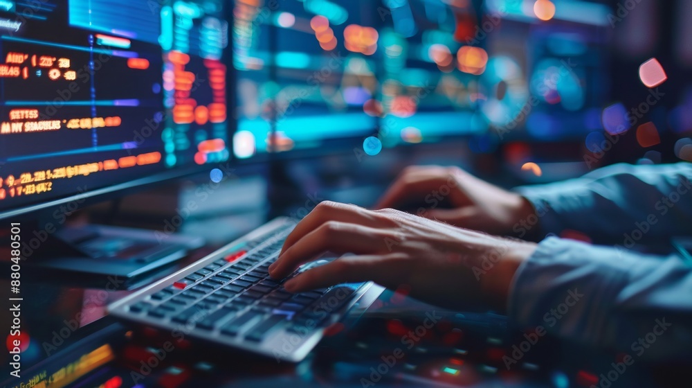 Wall mural : Close up of office specialist working on desktop computer in a modern technological monitoring contr