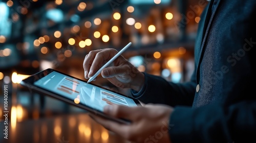 Wall mural : Close-up of person holding a tablet and using a stylus to interact with a digital interface showing