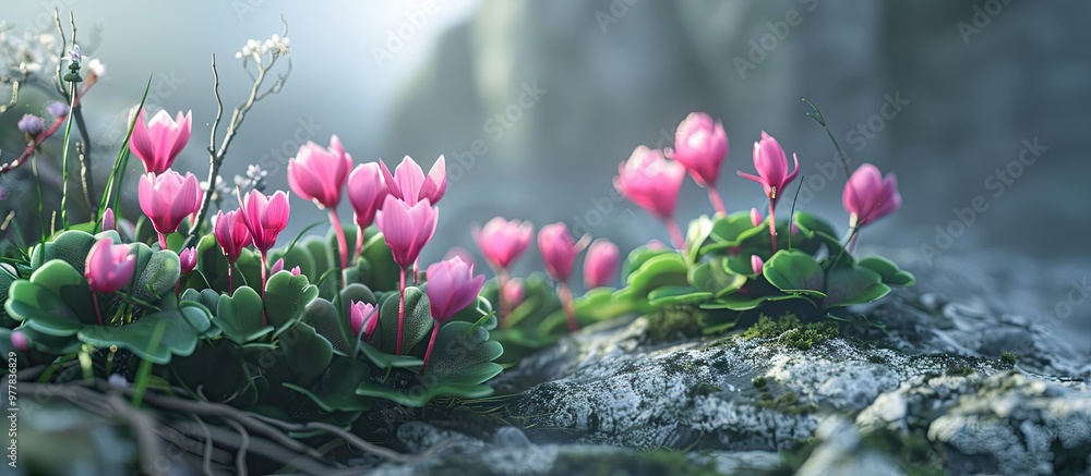 The watermark will not be included on Wall mural.: Close up of pink cyclamen in a natural setting - copy space image - place for adding text and design