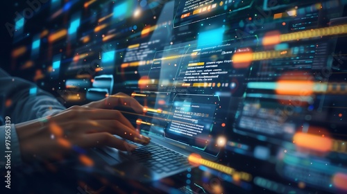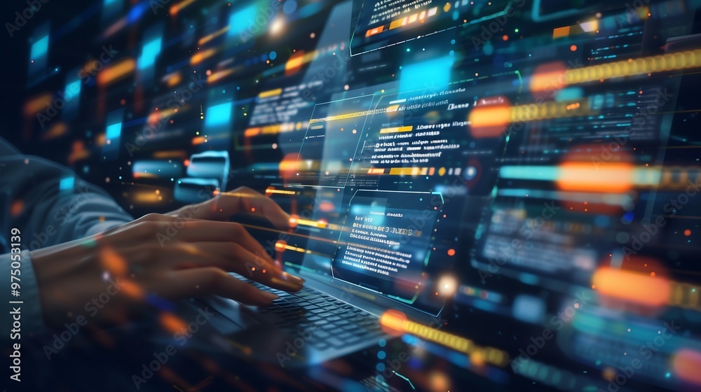 Wall mural close up of programmer hands typing code on laptop with abstract data streaming on screen - Wall murals Wall mural close up of programmer hands typing code on laptop with abstract data streaming on screen - Wall murals