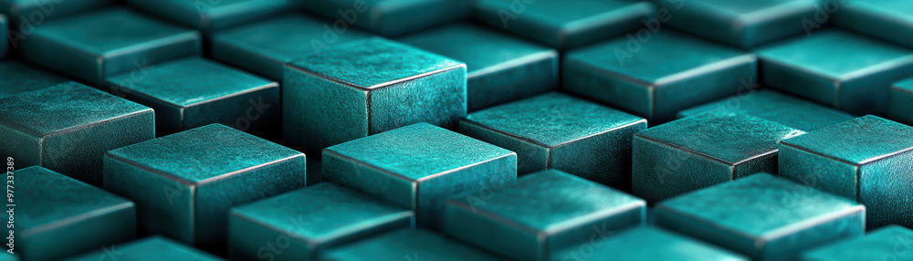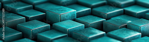 Wall mural close-up of teal metallic cubes forming a geometric pattern. modern abstract background with depth a