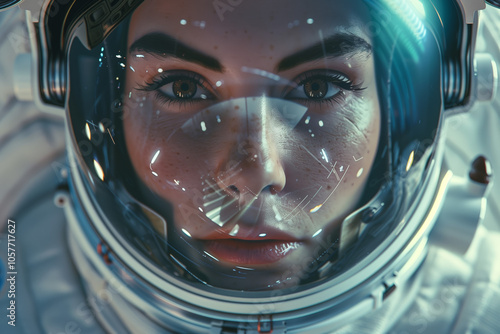 Close-up of the face and helmet visor of an astronaut woman floating in space -