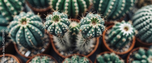 Wall mural : Close up of vibrant cacti in pots with thorns and unique patterns against a soft focus background fo