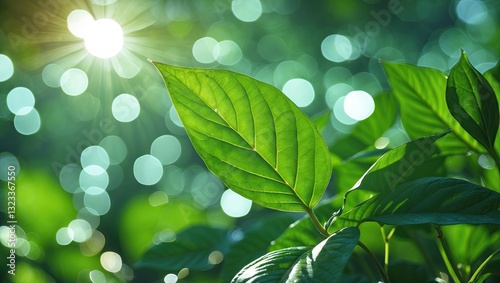 The watermark will not be included on Wall mural.: Close-up of vibrant green leaves with sunlight filtering through, creating a bokeh effect of light s
