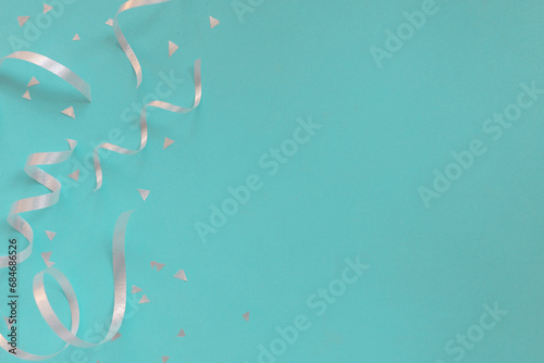 Wall mural close up on group of silver color of rolling ribbon and confetti on teal background with copy space