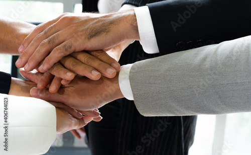The watermark will not be included on Wall mural.: Close up picture of hands of multiethnic business team touching in circle for sign of unity and inte