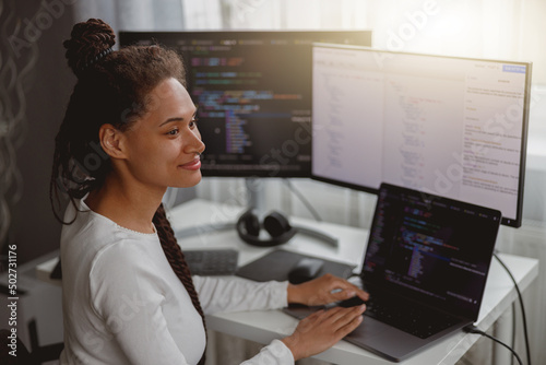 The watermark will not be included on Wall mural.: Close up portrait of young joyful woman coder works at home typing on laptop computer