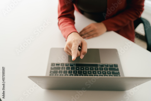 Wall mural : Close-up portrait typing keyboard on laptop computer - working online on white table at office - faceb