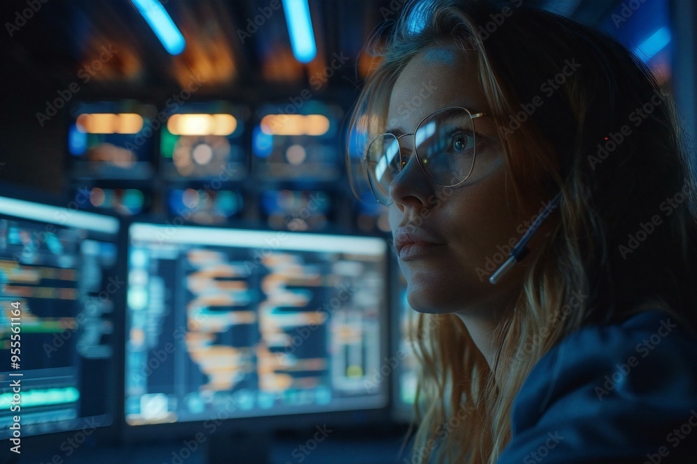 Wall mural close-up shot of a female developer coding in front of multiple computer screens in a modern office  - Wall murals Wall mural close-up shot of a female developer coding in front of multiple computer screens in a modern office - Wall murals