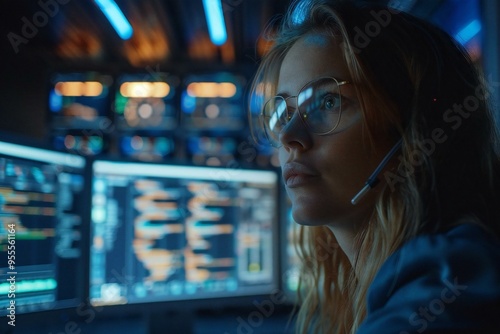 The watermark will not be included on Wall mural.: Close-up shot of a female developer coding in front of multiple computer screens in a modern office