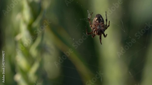The watermark will not be included on Wall mural.: Close up shot of a spider on a web between strands of wheat - macro