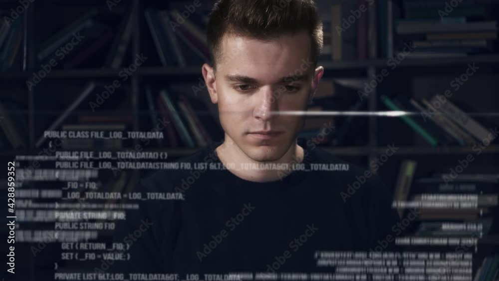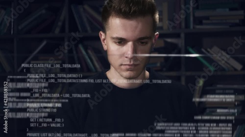 Close up shot of big data programmer working with program code on transparent screen in dark libraryWall mural