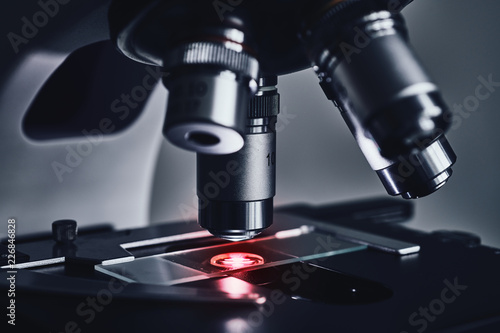 The watermark will not be included on Wall mural.: Close-up shot of modern microscope with sample slide at laboratory -
