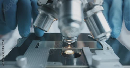 The watermark will not be included on Wall mural.: Close up shot of the scientist studies examining of test sample under the microscope in laboratory -