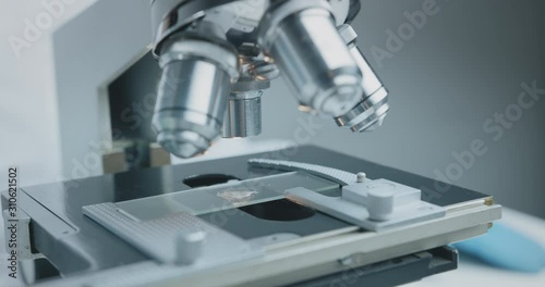 The watermark will not be included on Wall mural.: Close up shot of the scientist studies examining of test sample under the microscope in laboratory -