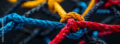 The watermark will not be included on Wall mural.: Close-up shot of vibrant ropes knotted together creating a colorful grid pattern, showcasing texture