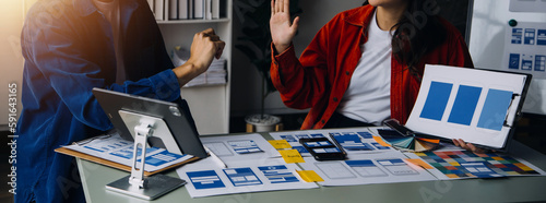The watermark will not be included on Wall mural.: Close up ux developer and ui designer brainstorming about mobile app interface wireframe design on t