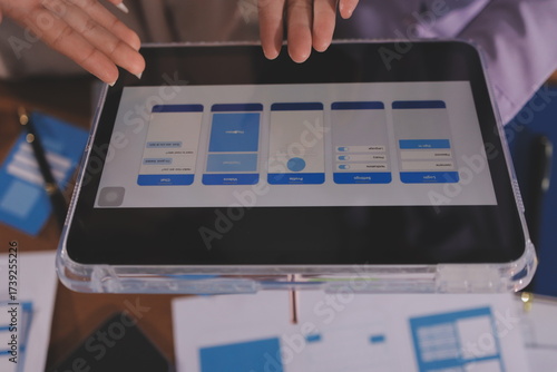 Wall mural : Close up ux developer and ui designer brainstorming about mobile app interface wireframe design on t