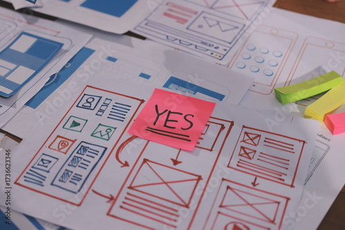 Wall mural : Close up ux developer and ui designer brainstorming about mobile app interface wireframe design on t
