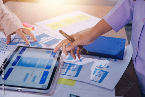 Wall mural : Close up ux developer and ui designer brainstorming about mobile app interface wireframe design on t