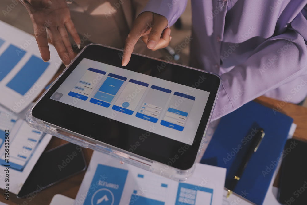 Wall mural close up ux developer and ui designer brainstorming about mobile app interface wireframe design on t - Wall murals Wall mural close up ux developer and ui designer brainstorming about mobile app interface wireframe design on t - Wall murals