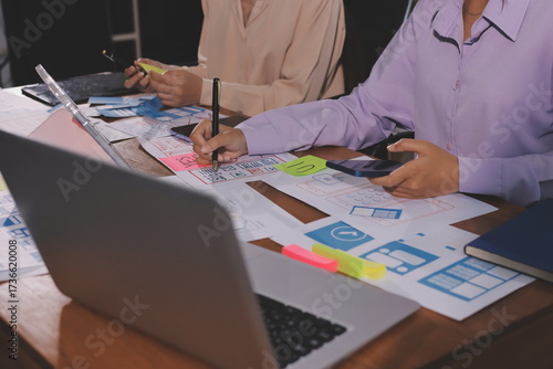 The watermark will not be included on Wall mural.: Close up ux developer and ui designer brainstorming about mobile app interface wireframe design on t