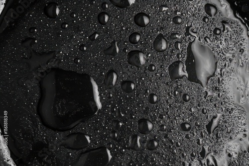 The watermark will not be included on Wall mural.: Close-up view of a glossy black surface covered in droplets - the droplets create intriguing reflecti