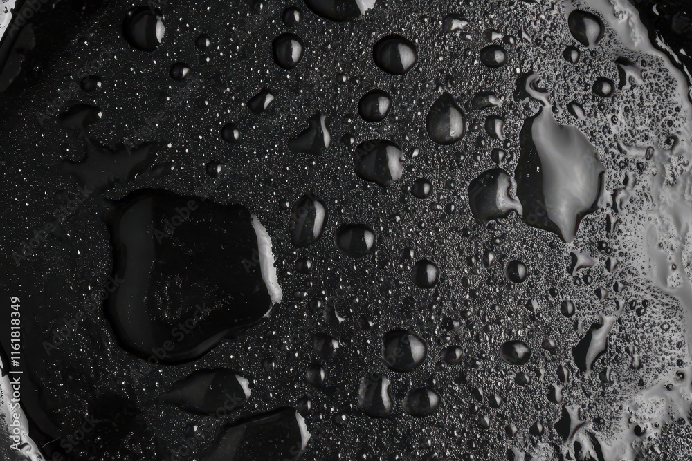 Wall mural close-up view of a glossy black surface covered in droplets. the droplets create intriguing reflecti