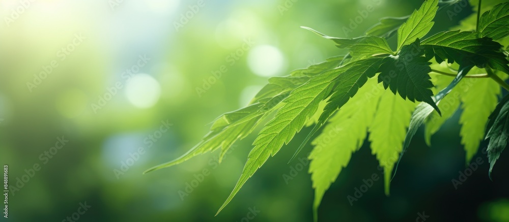 The watermark will not be included on Wall mural.: Close up view of a green leaf against a green garden backdrop with copy space image emphasizing a na