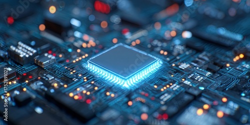 Wall mural : Close-up view of a microprocessor surrounded by circuit patterns and blue glow in technology concept